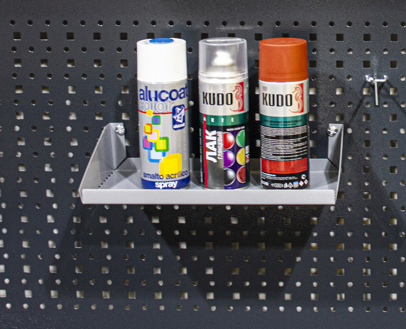 Полка навесная 325x155 мм (ШxГ) производства ДВК. Отлично подойдет к нашей металлической мебели. Ознакомьтесь с ней на странице нашего магазина, там же Вы найдете другие навески и держатели.