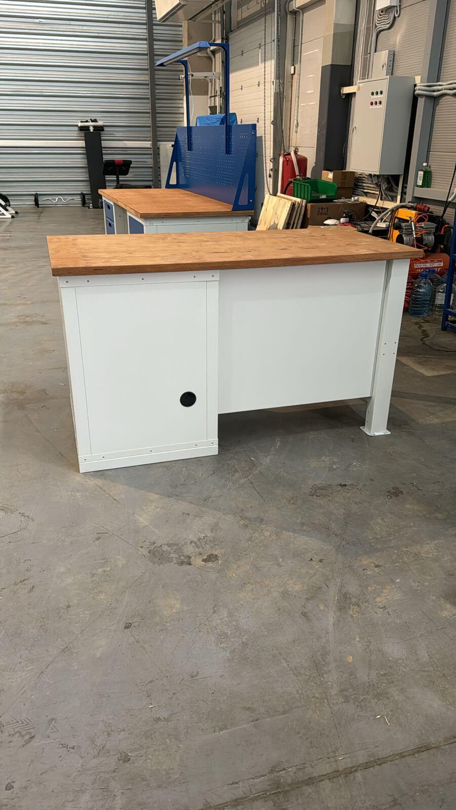 - Верстак высотой 830 мм до нижнего края столешницы, шириной 1200 мм и глубиной 745 мм, с одной опорой, полкой/стенкой глубиной 300 мм и шириной 480/760 мм, одной тумбой ВхШхГ, мм: 830х600х685 (с цоколем)