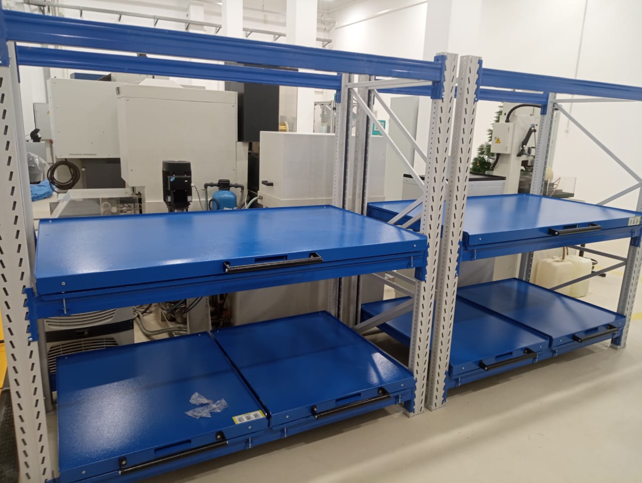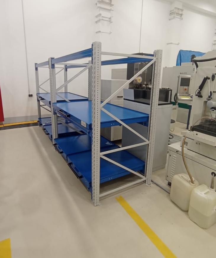 - Выкатная платформа на шарикоподшипниковых направляющих, закрепленных на балках стеллажа при помощи стяжных кронштейнов (4 шт/платформу), с ручкой и фиксатором (блокировка выкатывания)
